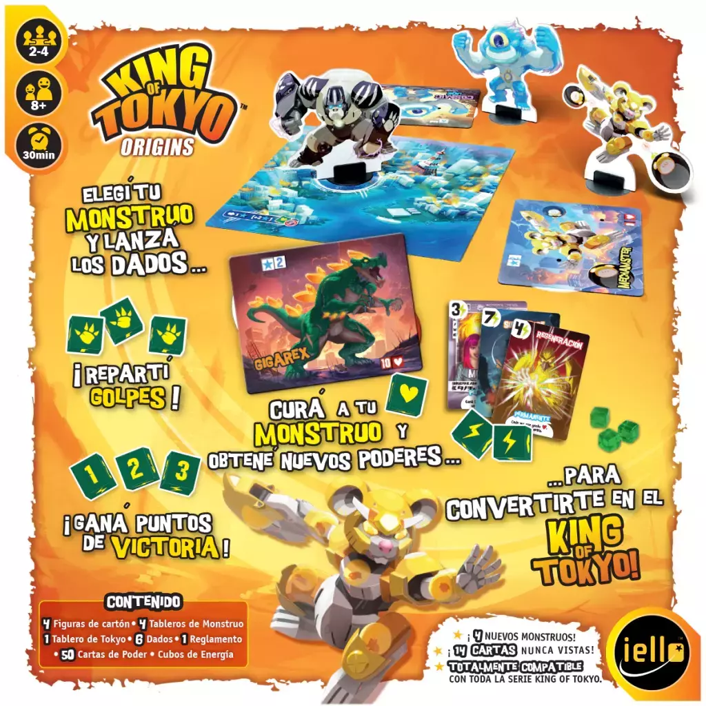 En King of Tokyo: Origins te pondrás en la piel de un monstruo gigante que lucha por el dominio de la ciudad. Con una estética completamente renovada y reglas simplificadas, esta nueva edición es ideal para quienes quieren iniciarse en el mundo de King of Tokyo o compartirlo con jugadores más jóvenes.