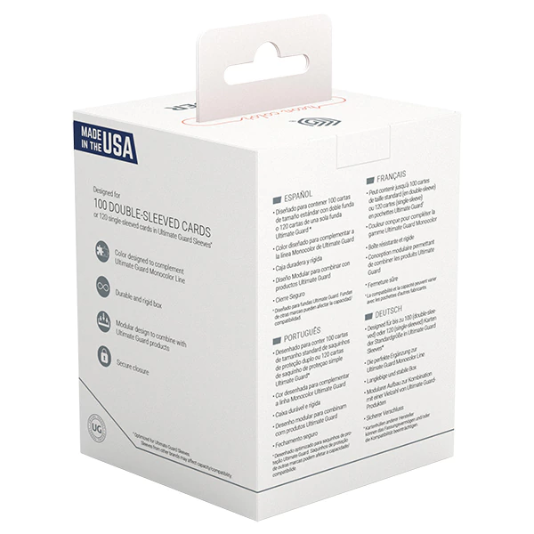 Caja Porta Mazos sólido y práctico, de textura suave y fácil apertura. Con capacidad para la protección y el almacenamiento seguro de hasta 100 cartas tamaño estándar, con doble folio. Fabricadas especialmente para encajar perfectamente en los Arkhive de Ultimate Guard.