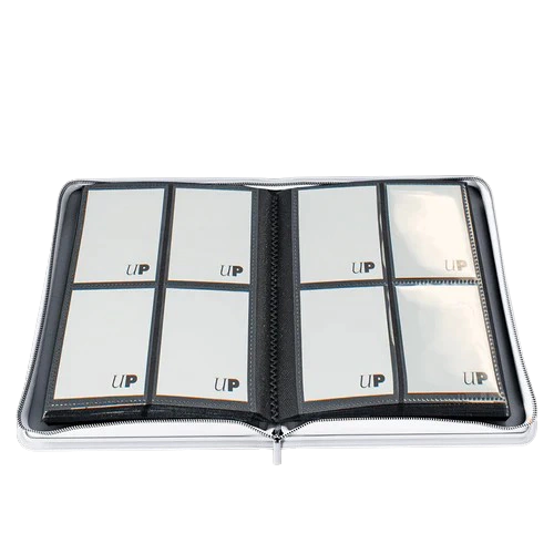 Las carpetas PRO-Binder Zippered Vivid están diseñadas para organizar y coleccionar tus cartas favoritas. Cada carpeta presenta una cubierta de cuero sintético acolchada y un cierre con cremallera. Contiene 20 páginas de hojas de 4 bolsillos tamaño Standard, color negro. Diseño de carga lateral para evitar que las cartas se caigan fácilmente. La correa elástica mantiene cerrada la carpeta cuando no está en uso. Todos los materiales están hechos de material que no sea de PVC, libre de ácidos y seguro para archivar. Permite almacenar hasta 160 cartas enfoliadas tamaño Standard